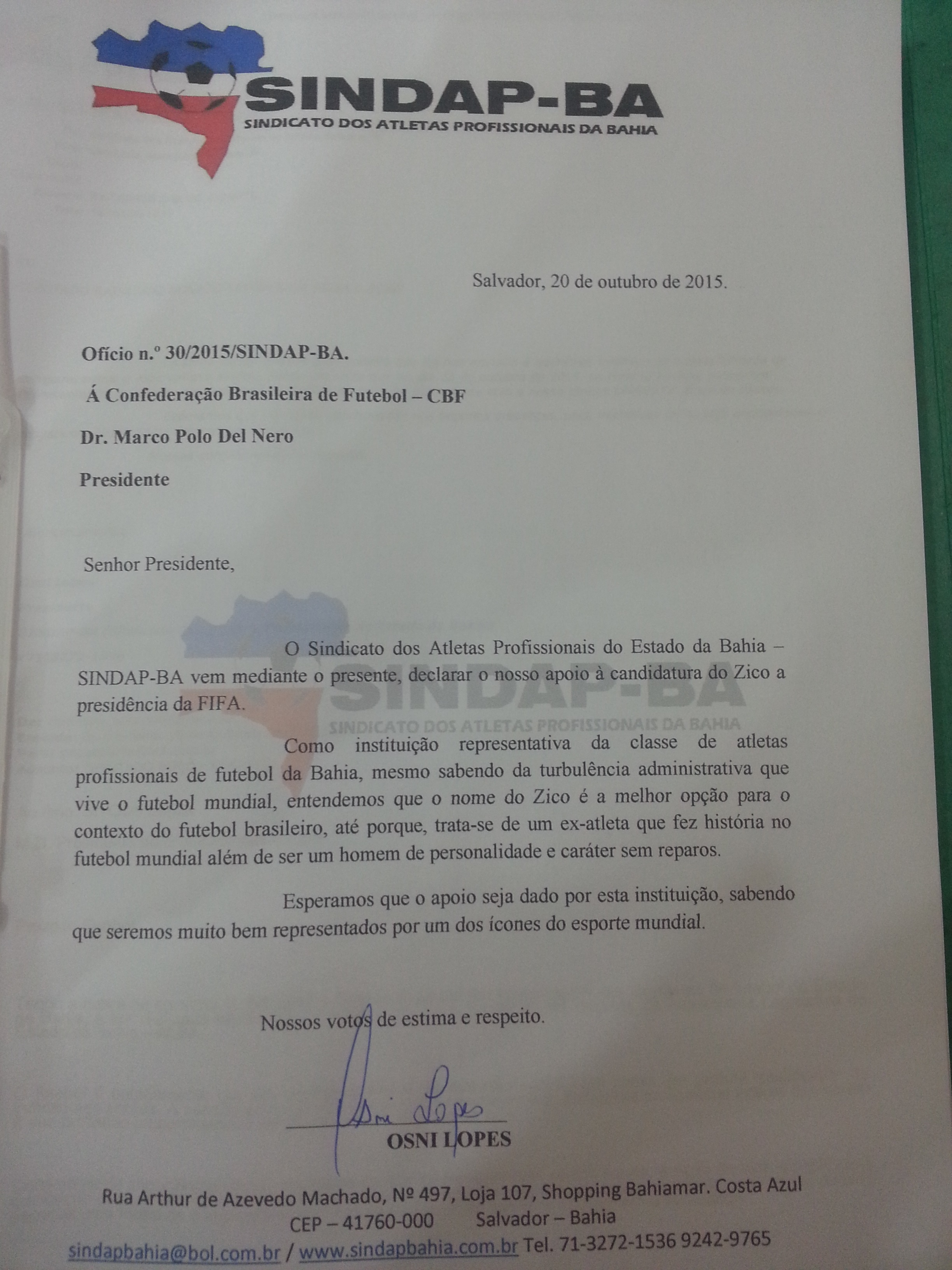 SINDAP-BA apoia e pede apoio à ZICO como presidente da FIFA