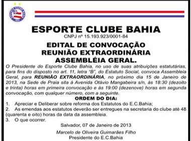 A atual direção do Esporte Clube Bahia divulgou, nesta terça-feira (8), o edital de convocação para a assembleia-geral de sócios que poderá definir o futuro do Esquadrão de Aço. A expectativa dos torcedores é a de que o atual presidente, Marcelo Guimarães Filho, cumpra o que promete desde 2009: a realização da eleição direta para escolha do dirigente do tricolor baiano. Entre os assuntos, que serão discutidos no próximo dia 15 de janeiro com os associados na sede de praia, está a reforma do estatuto do clube. A última mudança no texto, elaborado e implantado em 1981, foi em 2008, durante a gestão de Petrônio Barradas. Em uma recente participação no programa Entrevista Coletiva, da TV Band Bahia, Guimarães Filho, que é filiado ao PMDB, voltou a prometer uma consulta democrática. “Eu acredito que o sócio deva sim ser determinante no futuro do seu clube. [...] Levarei isso, a deliberação da assembleia-geral de sócios, para que na próxima eleição, que será em 2014, o sócio já possa votar para presidente”, voltou a garantir.